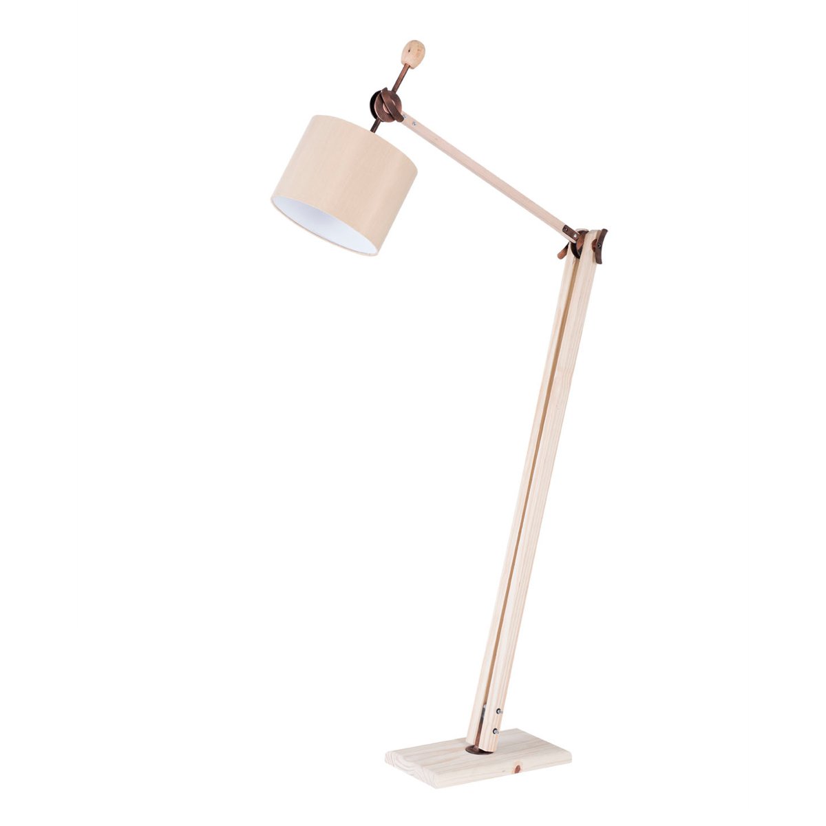 Luminária decorativa e funcional com estrutura em madeira, partes metálicas em aço carbono e cúpula de tecido.